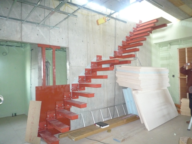 特注持ち出し階段も鉄骨下地が取り付きました