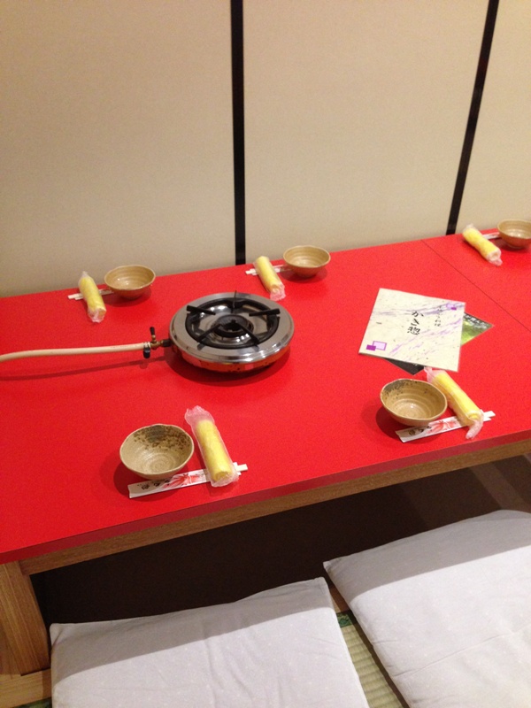 朱色の座卓と卓上ガスコンロ。 結構古風な店内(笑)