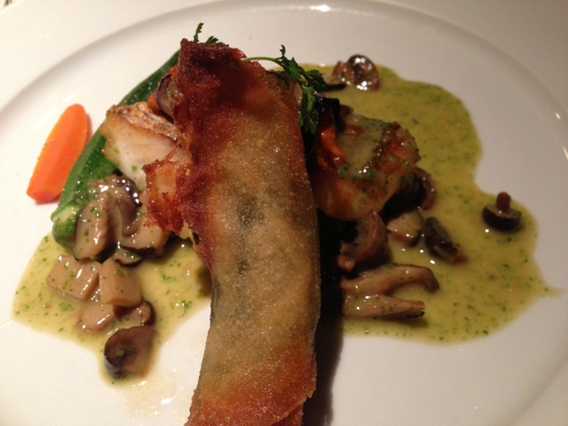 「白身魚のソテー、エビとカニのパート巻きキノコソース」