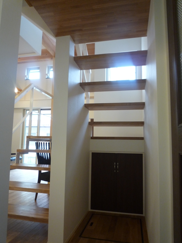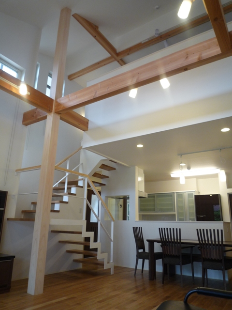 床にはナラの無垢材、部分的に見える架工にも無垢材を。