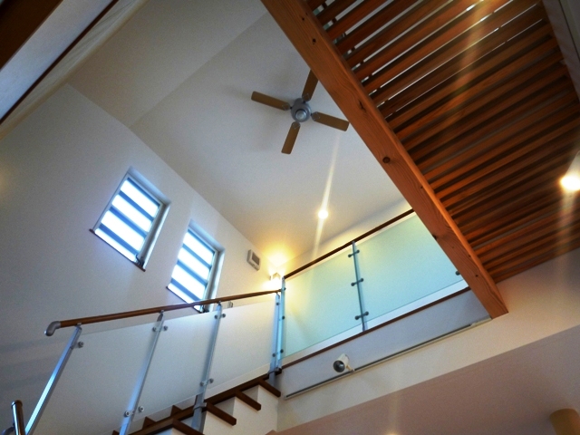 吹抜けの上部(2階部分)の窓も夏場の熱気を自然に