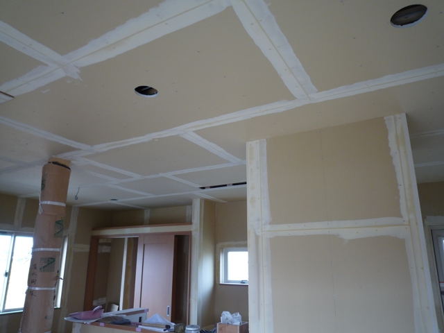 下地になる石膏ボードの継ぎ目を丁寧にパテで