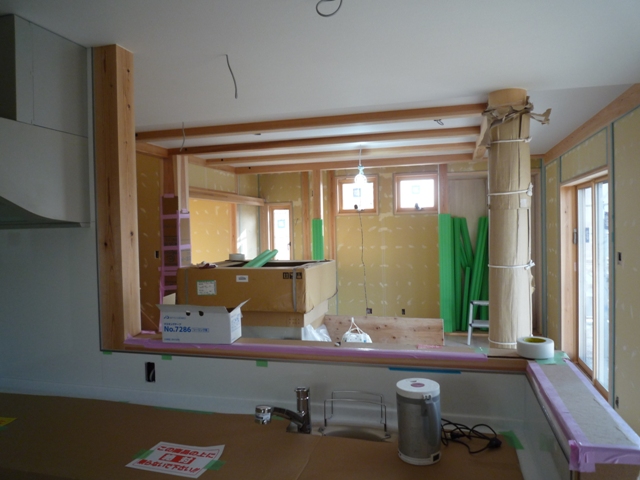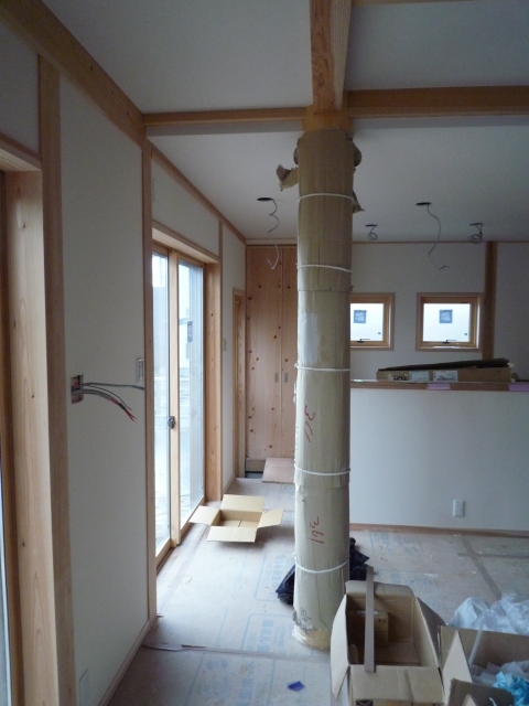 キッチン側から見た感じです。右の写真には、丸太の柱が聳え立つのが見えます。